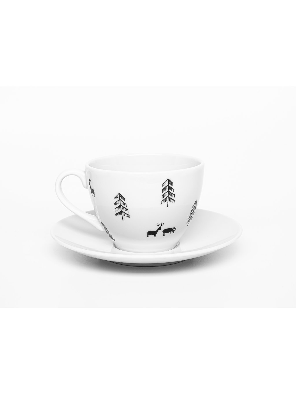 Šálek na kávu či čaj s dekorem jelínků v lese.