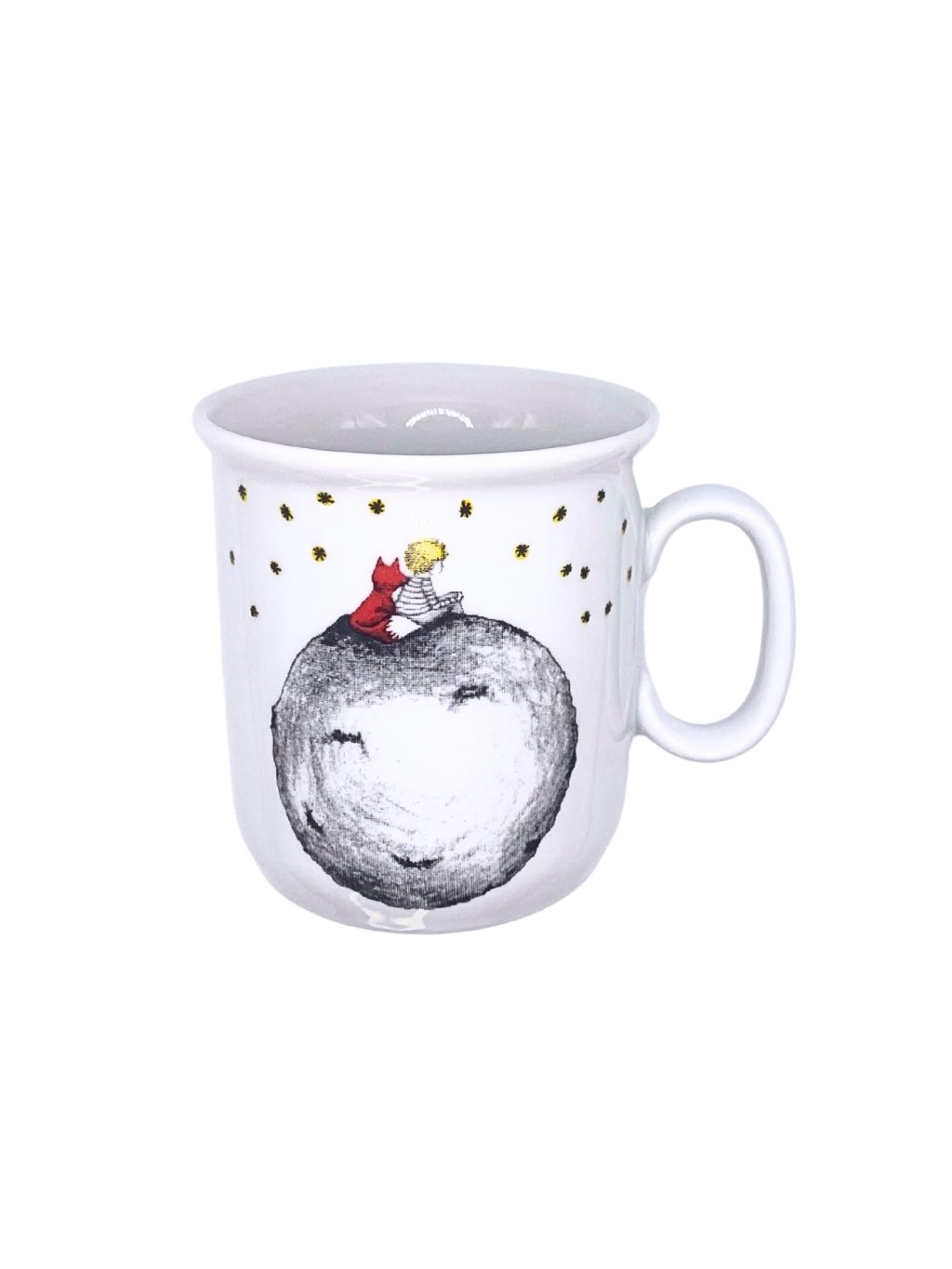 Menší hrnek na teplé mléko, kakao či čaj s dekorem Malého prince a lišky na planetě. Ideální velikost pro děti.