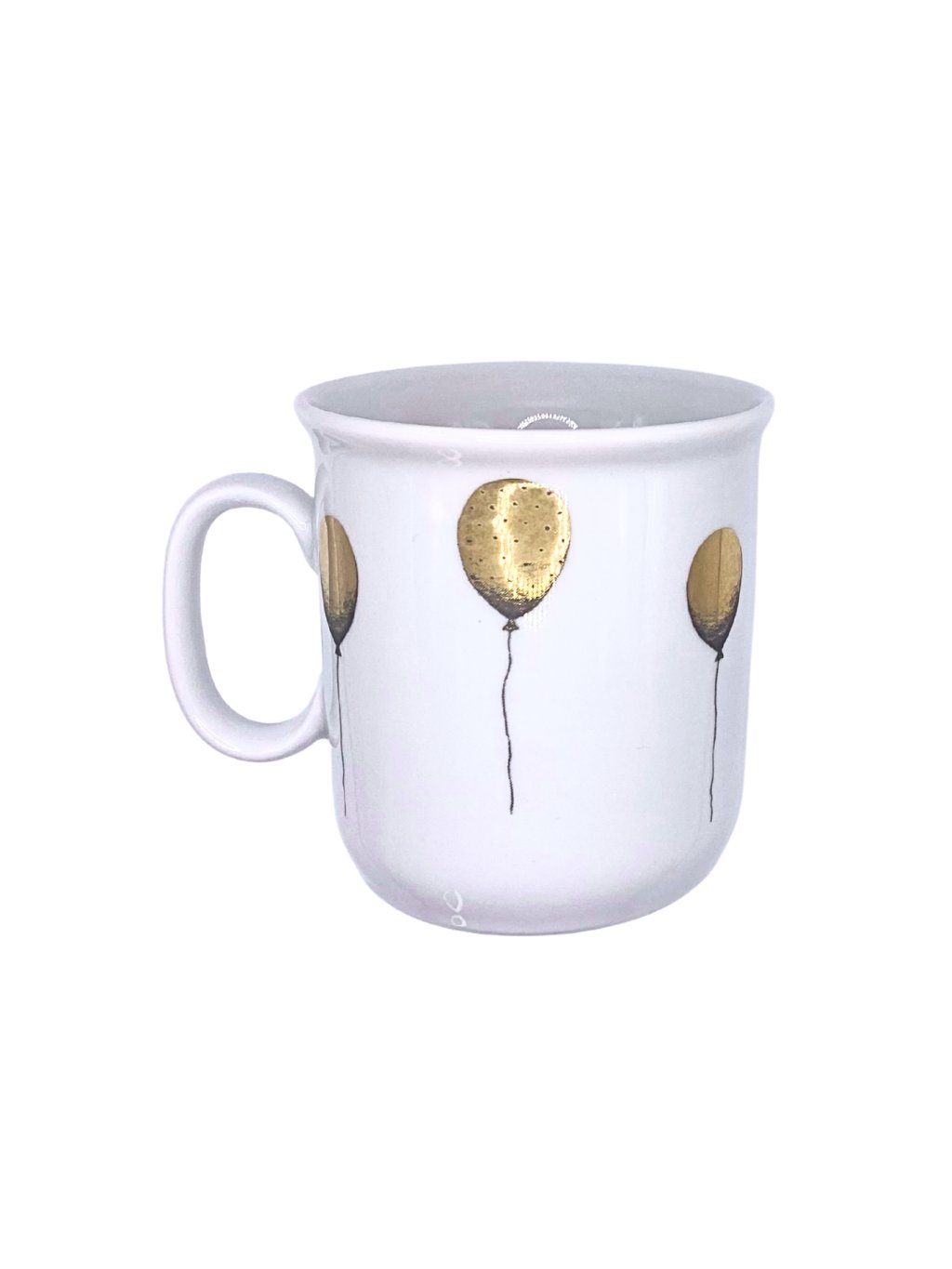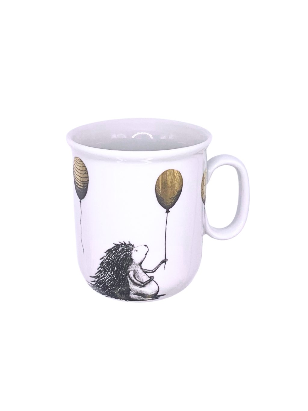 Menší hrneček s motivem narozeninového dikobraza, který by se měl radši držet dál od narozeninových balónků.