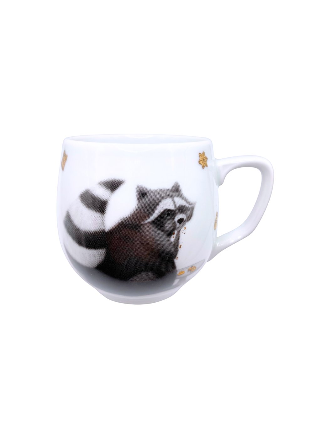 Baňatý hrnek na čaj či větší kávu s dekorem spokojeného mývala, který se konečně dočkal svého oblíbeného vánočního období.