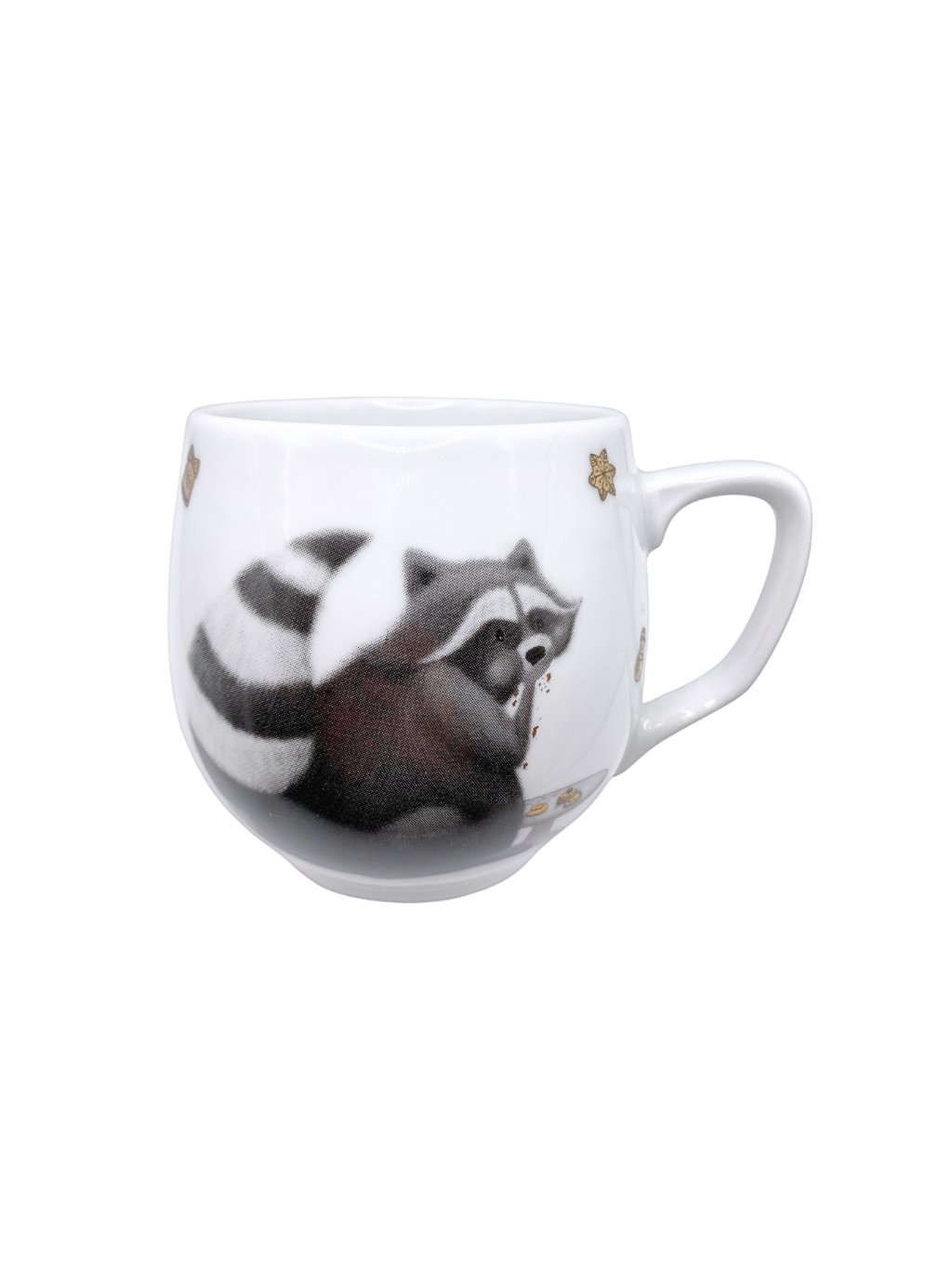 Baňatý hrnek na čaj či větší kávu s dekorem spokojeného mývala, který se konečně dočkal svého oblíbeného vánočního období.