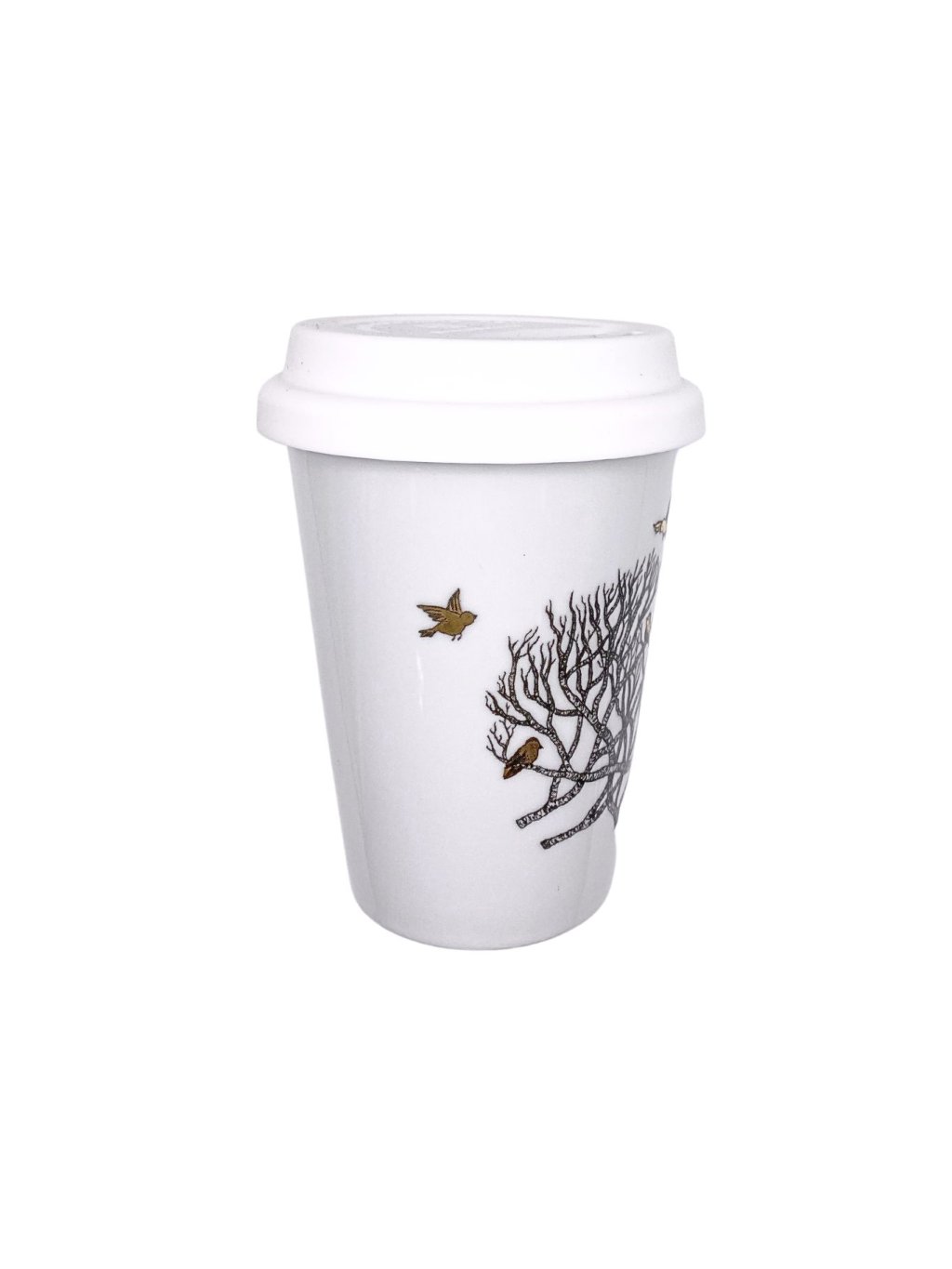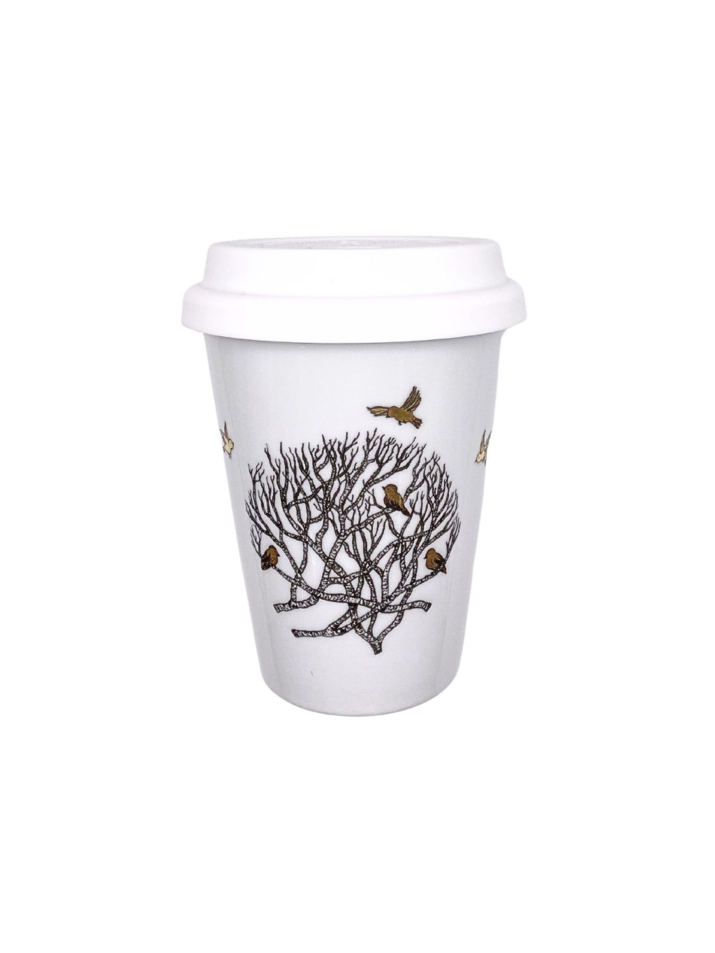 Porcelánový TO GO CUP s motivem keře a drobných zlatých ptáčků, kteří v něm hledají úkryt. Výběrem porcelánového hrnku místo jednorázových kelímku pomůžete redukovat tuny zbytečného odpadu. Malá změna ve Vašem každodenním rituálu může mít obrovský dopad. Dejme sbohem jednorázovým kelímkům a přivítejme stylovou, ekologickou volbu-porcelánový TO GO CUP.