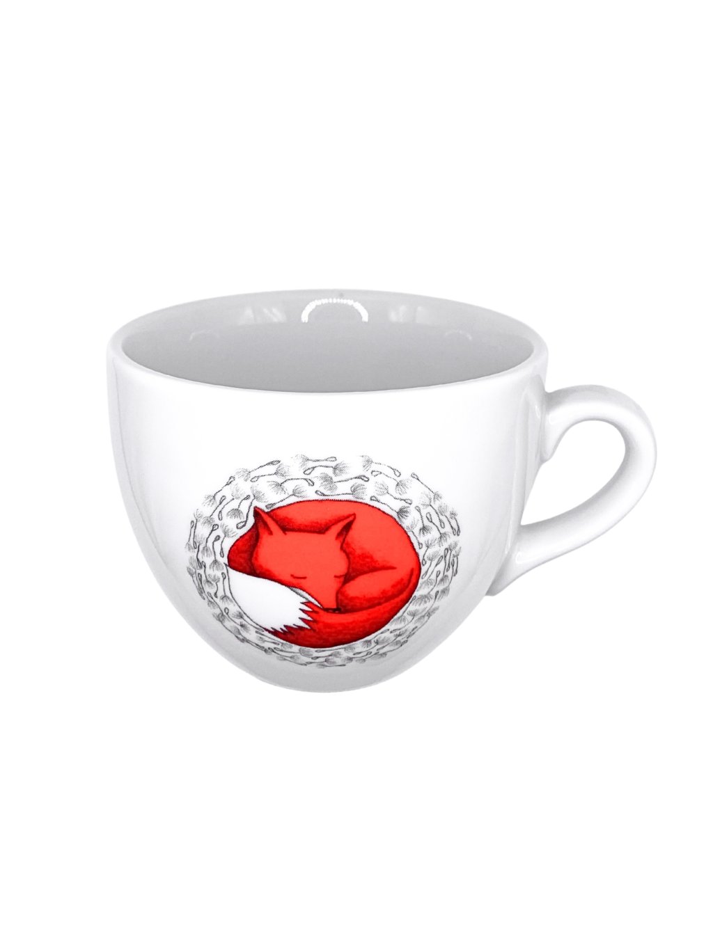 Šálek na větší kávu či čaj s dekorem spící pampe-lišky v chmýří.