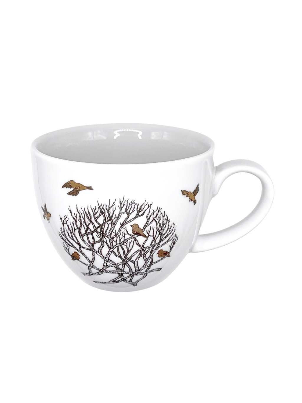 Šálek na čaj či větší kávu s dekorem zlatých ptáčků v keři.