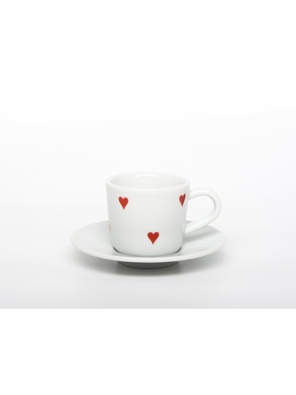 Šálek na espresso s dekorem srdíček. Motiv byl zpracován na základě maminčiné vzpomínky na oblíbený rozbitý hrneček z chaty.