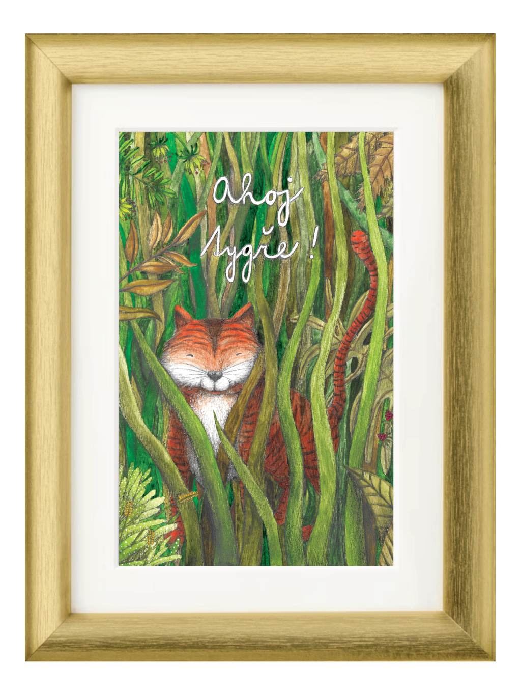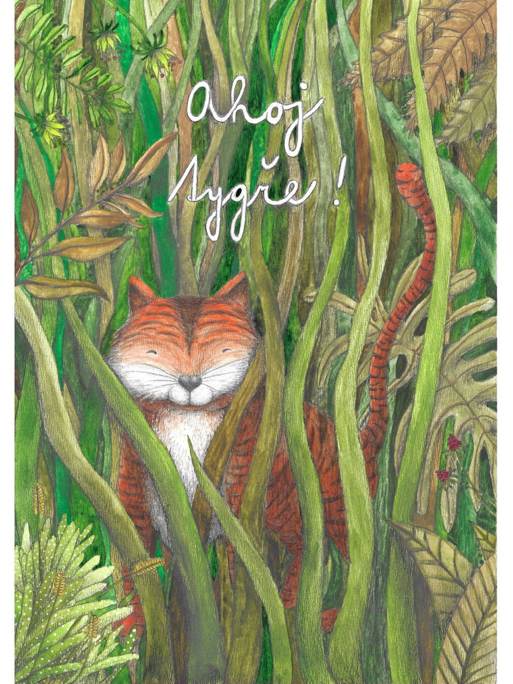 Ilustrace tygra v džungli. Pro milovníky jemných kolorovaných kreseb a jazykových hříček.