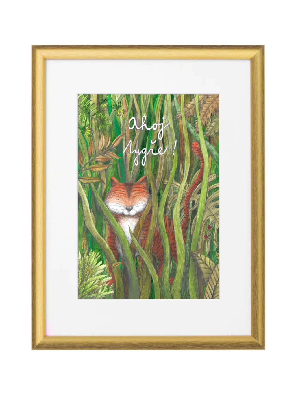 Tisk kolorované kresby tygra v džungli. Tisková série je limitována 50 kusy. Každý kus je podepsán autorkou a očíslován. Rám s paspartou je součástí objednávky.
