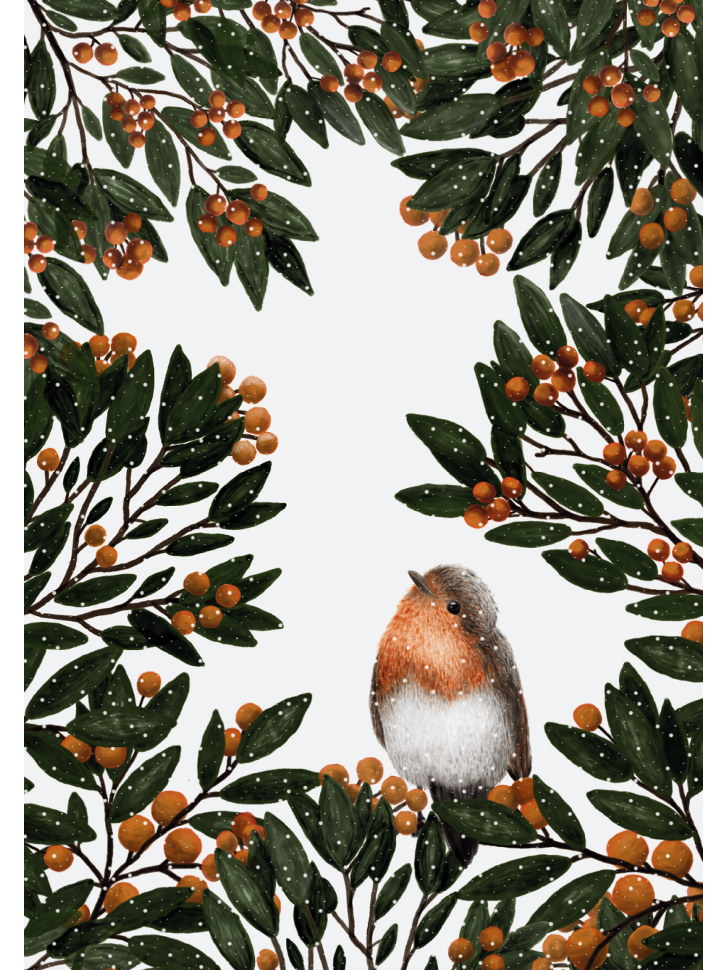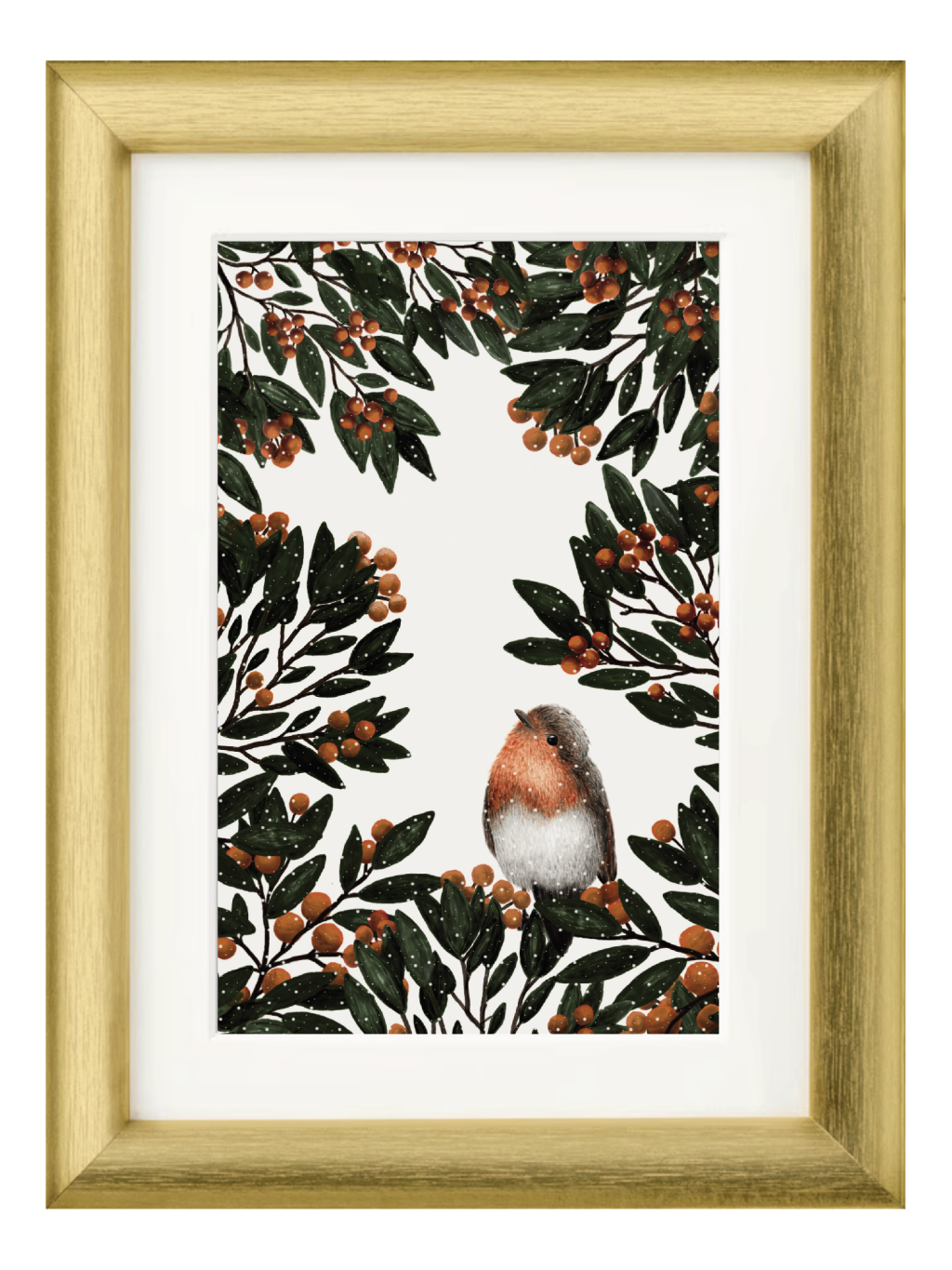 Tisk digitální kresby červenky, která se schovává v keři před sněhovými vločkami.