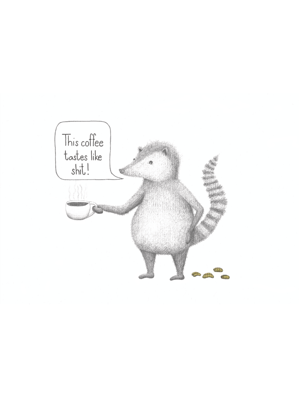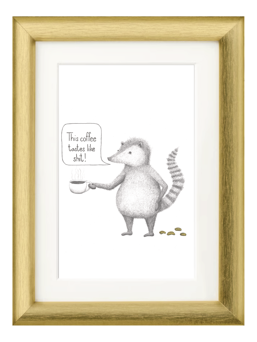 Tisk autorské kresby kritické cibetky s textem:"This coffee tastes like shᕯt. Ideální obraz do domácnosti kávových nadšenců.