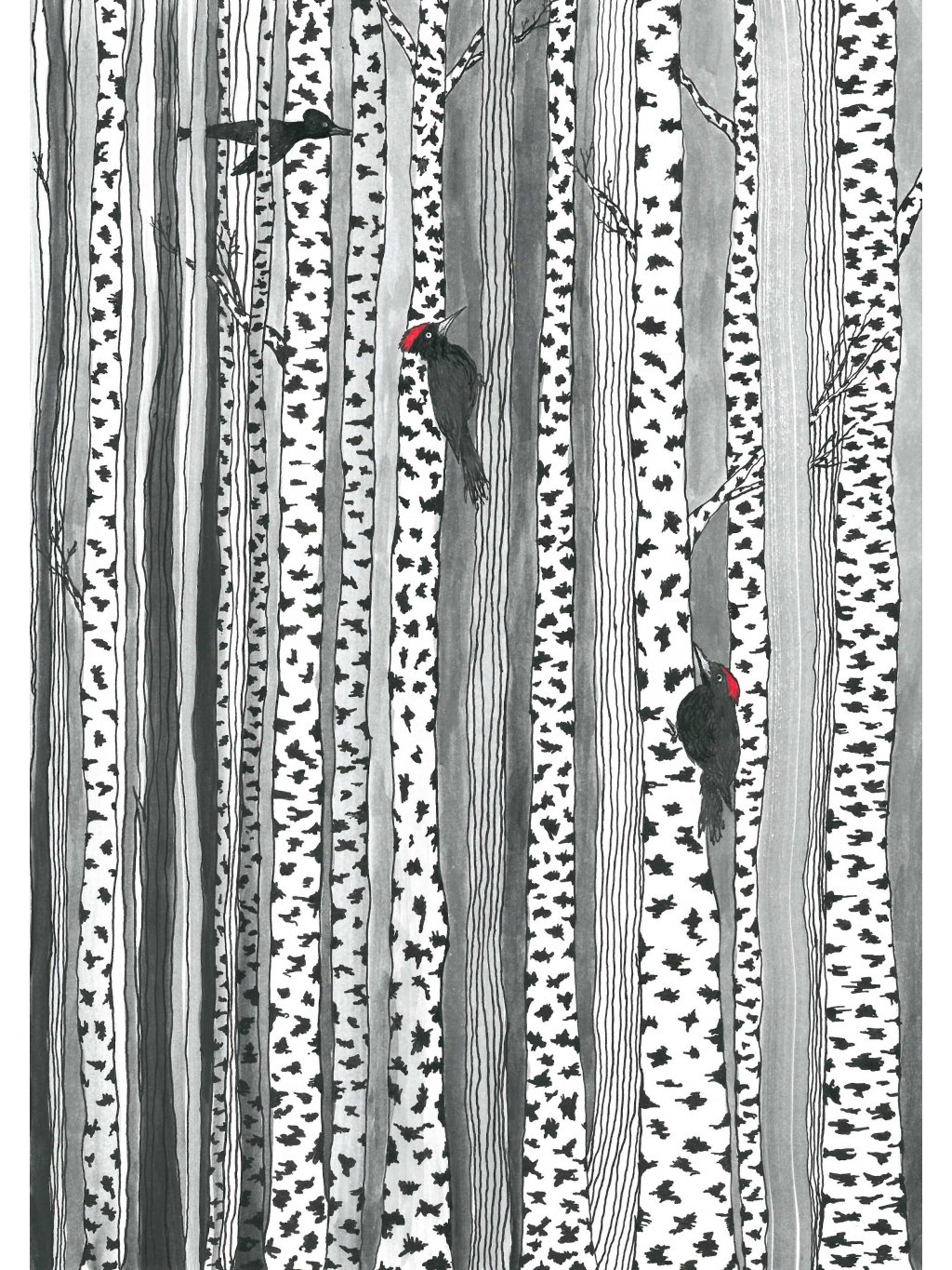Šálek na kávu či čaj s dekorem březových stromů a doktora datla.