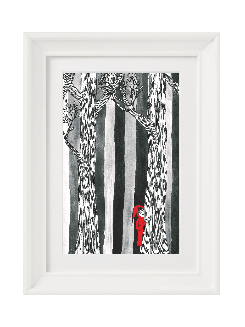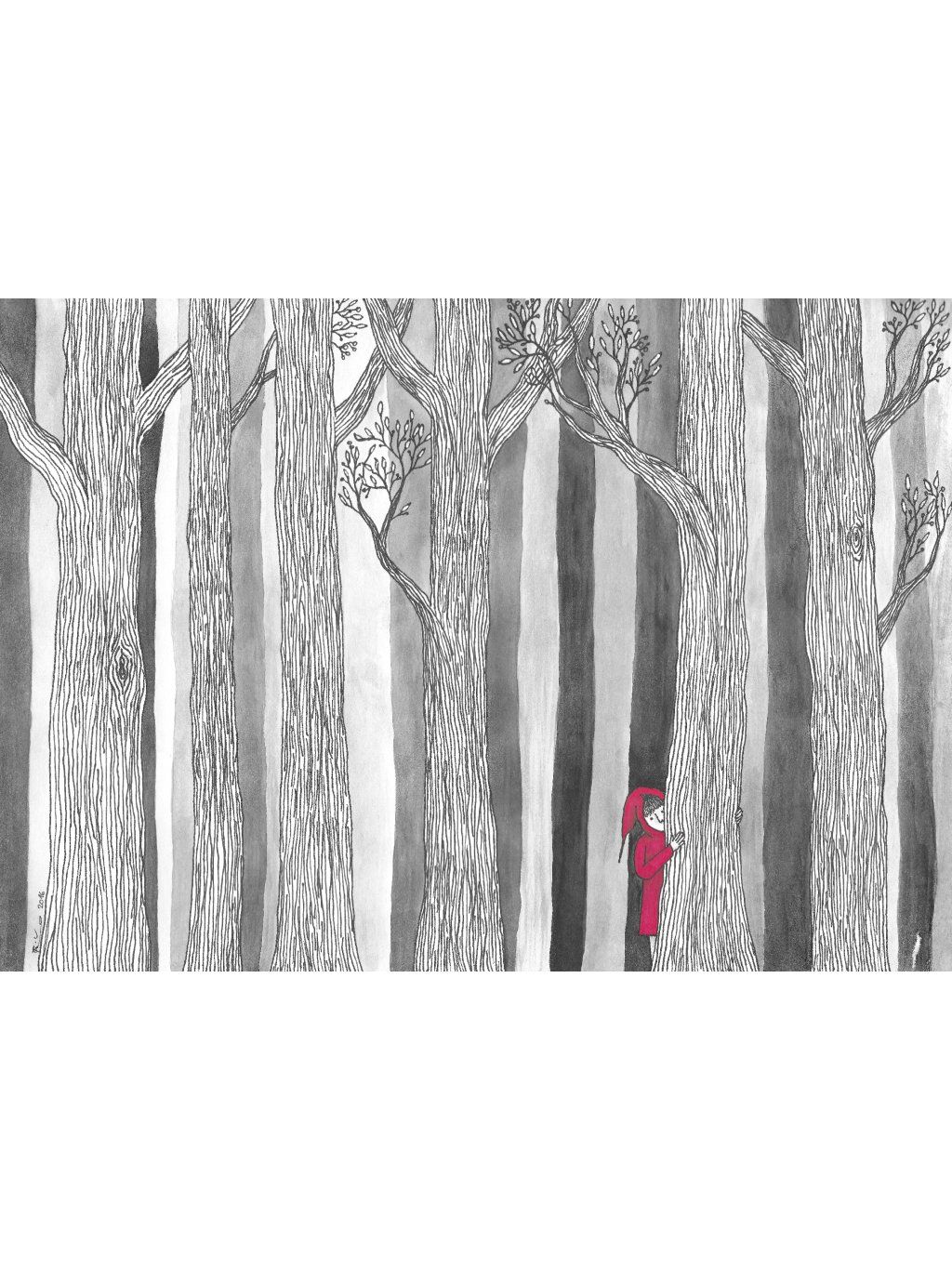 Kolorovaná kresba Červené Karkulky v temném lese.