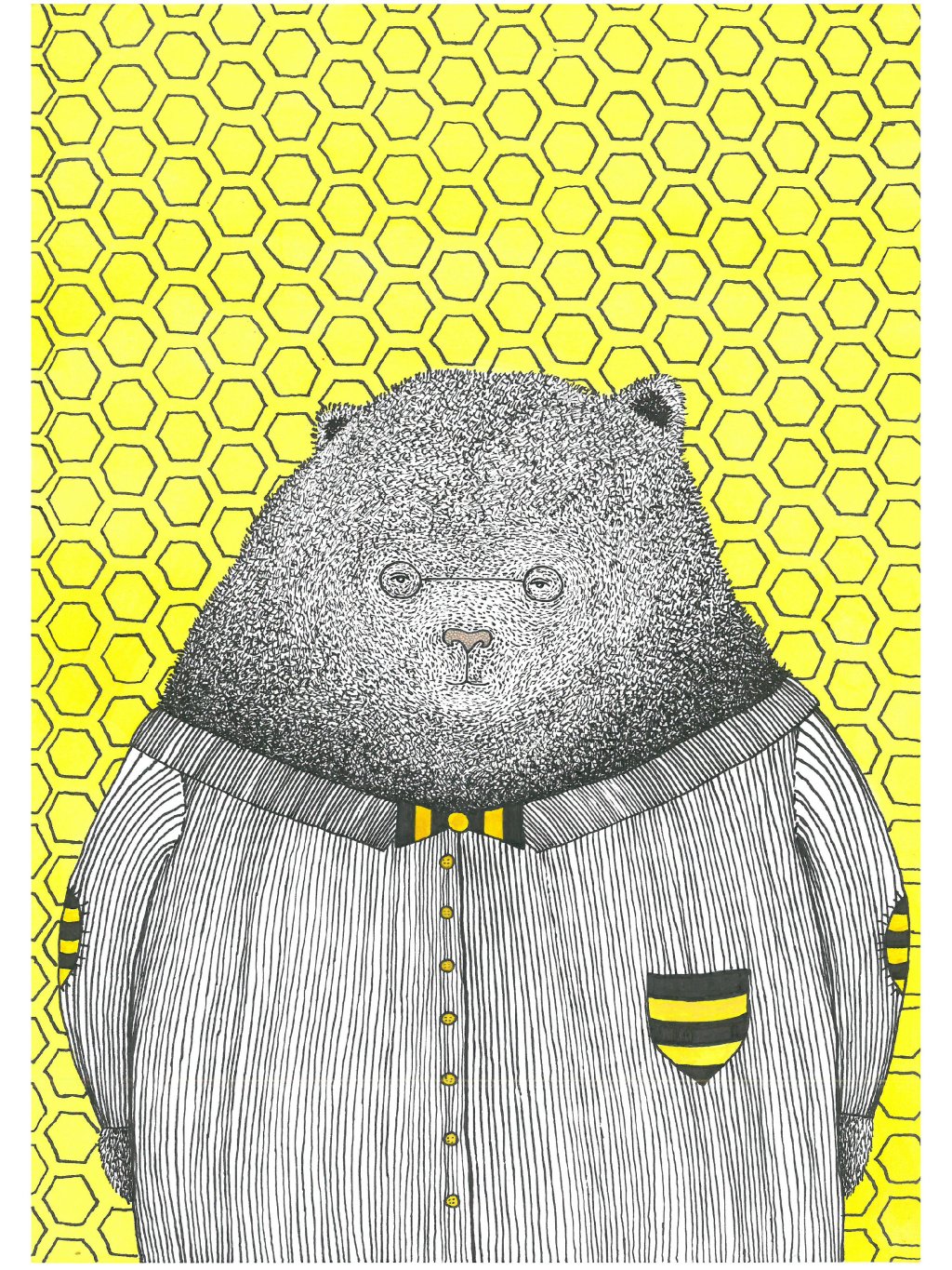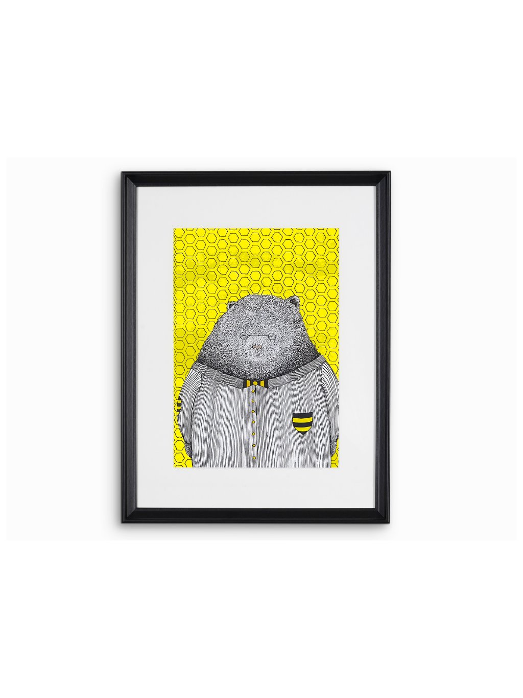 Tisk kolorované perokresby med-vědce mezi plástvemi medu. Každý kus je podepsán autorkou. Rám s paspartou je součástí objednávky.