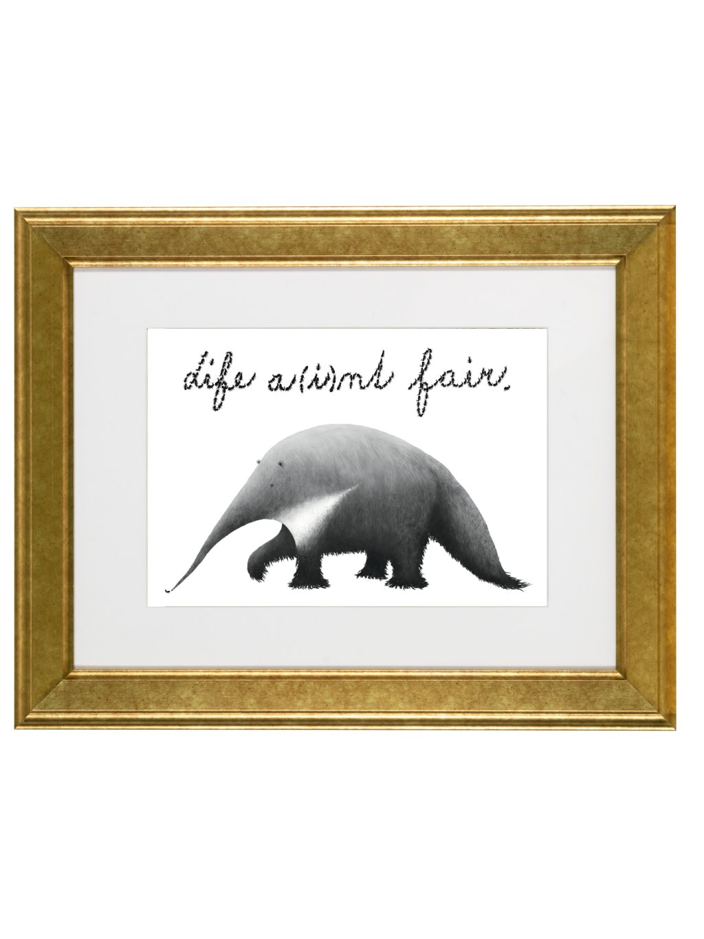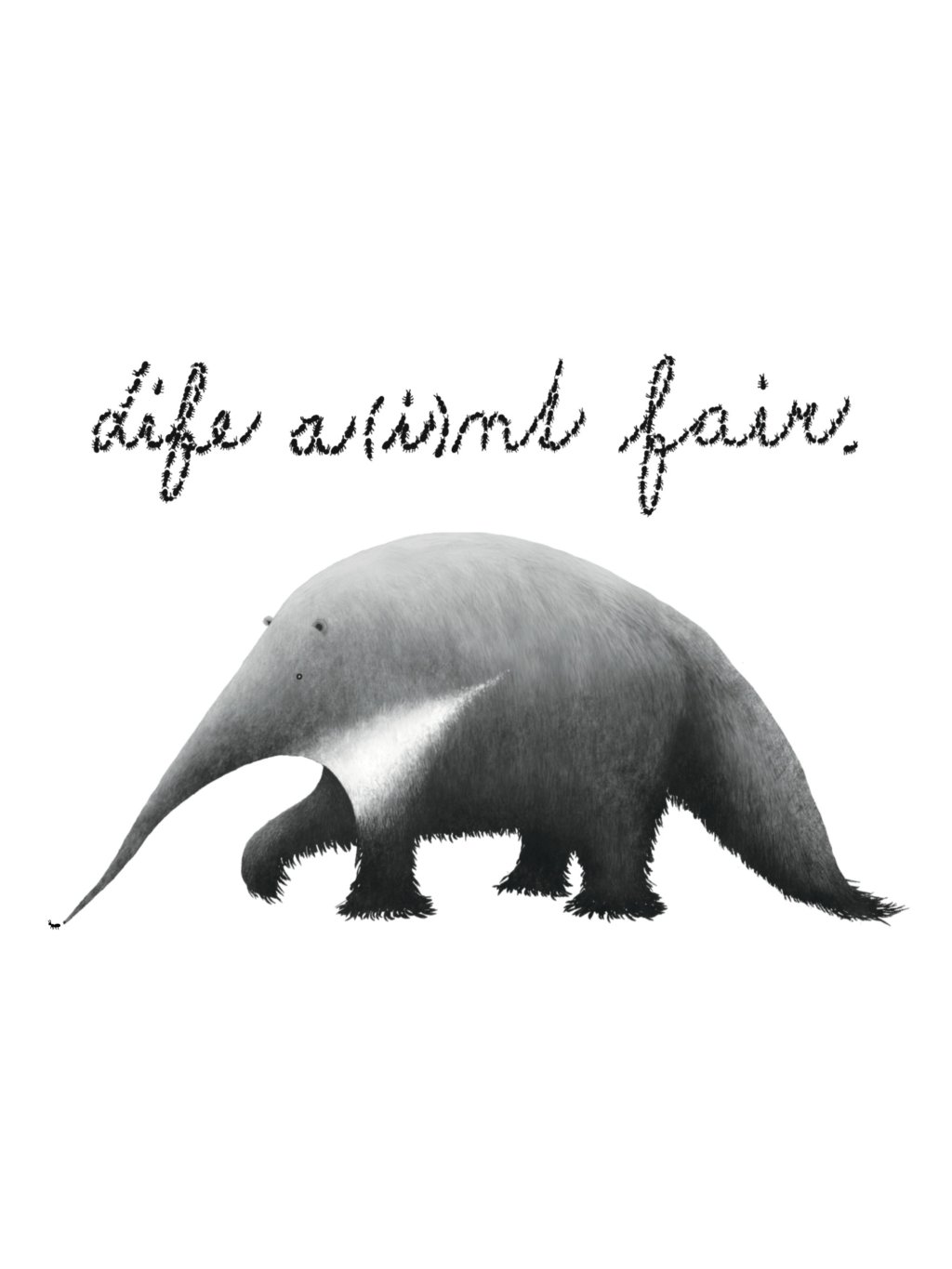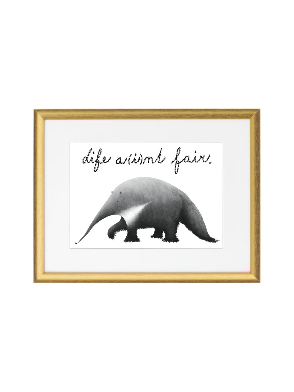 Tisk digitální kresby loudavého mravenečníka a nešťastného mravence s jazykovou hříčkou:"Life a(i)nt fair".
