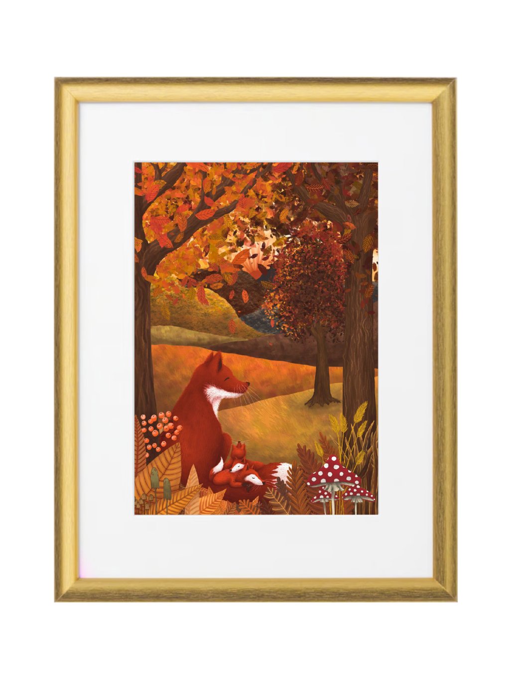 Tisk digitální kresby matky lišky s liščaty v podzimní krajině. Tisková série je limitována 100 kusy. Každý kus je podepsán autorkou a očíslován. Vybírat můžete ze dvou variant:
