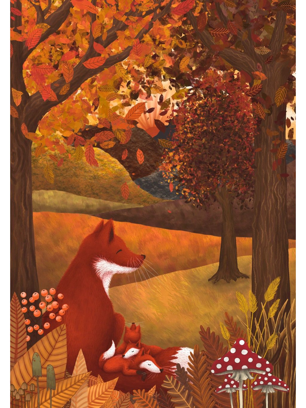 Tisk digitální kresby matky lišky s liščaty v podzimní krajině. Tisková série je limitována 100kusy. Každý kus je podepsán autorkou a očíslován. Rám s paspartou je součástí objednávky.