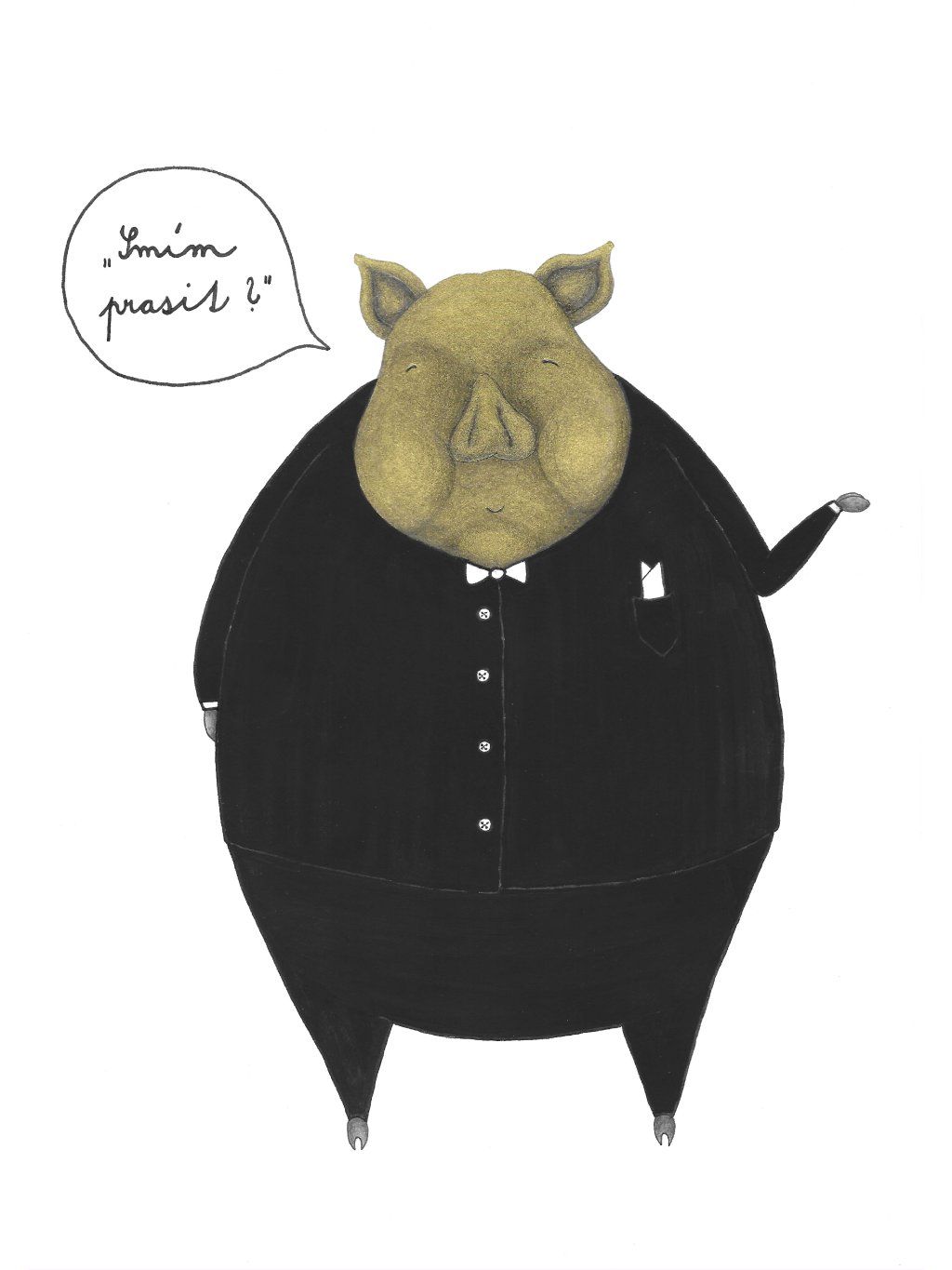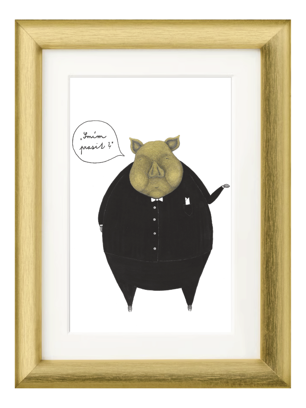 Tisk autorské kolorované kresby gentlemanského prasáka. Tento kus vznikl na zakázku jako narozeninový dar pro pana Steinhausera.