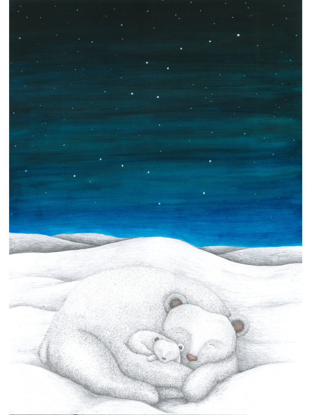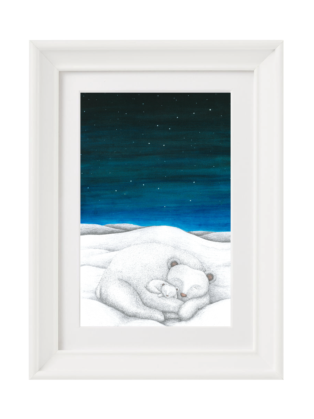 Tisk kolorované kresby Velké medvědice, která odpočívá s mládětem pod hvězdnou oblohou. Každý kus je podepsán autorkou. Rám s paspartou je součástí objednávky.